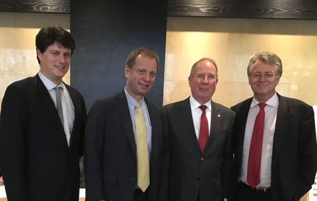 酒店总经理包伟贤(右二)于会议期间代表富豪环球东亚酒店热情迎接了国际货币基金组织驻华首席代表席睿德(左二),中国欧盟商会主席伍德克(右一)及卢森堡大公国驻上海总领事吕可为(左一)。
