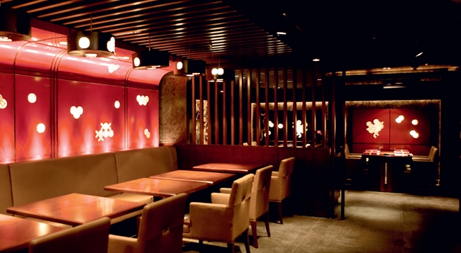 虽然餐厅有一半面积是位于地下,但是店家依然利用巧妙的装饰和布置弥补了这个空间不足,暗色系灯光设计配合花朵状的光影图案的投射,轻松营造出一种淡淡的幽静神秘感。餐厅楼上部分可以品尝开放式铁板烧,楼下更适合单点。