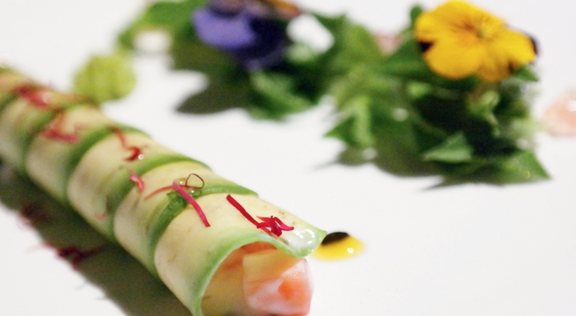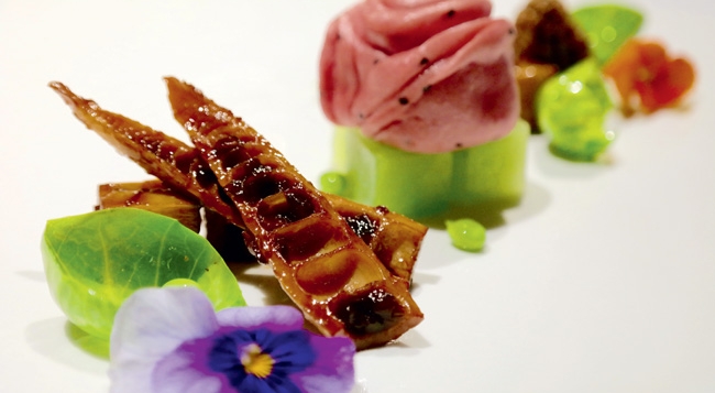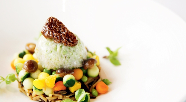 • 豉椒牙签面筋温韧香辣,凉拌虫草花清爽适口。高汤竹笙蛋鲜香清甜。芡实蜜豆脆核桃选用新鲜芡实,弹糯有嚼头,和嫩嫩的豌豆与脆生生的仙核桃仁同烹,颇有钟灵毓秀之感。